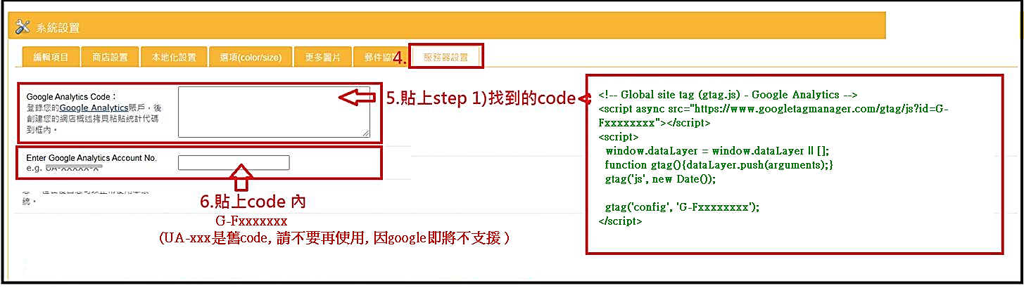 analytics code” + “Google analytic account No.”後, 請按以下方法, , 貼上您網店後台, 便可連接您的 “Google Analytics 數據分析)