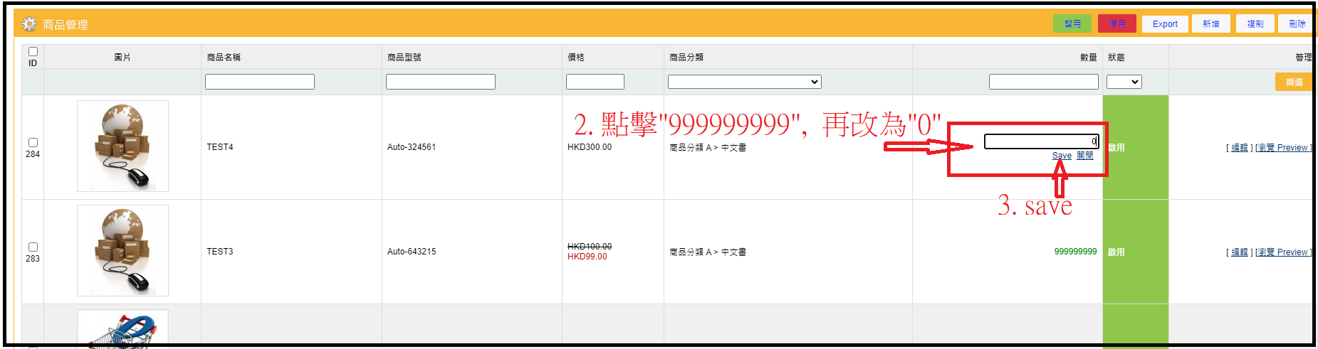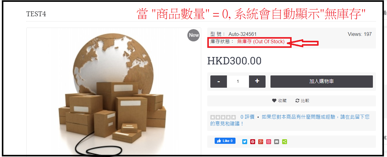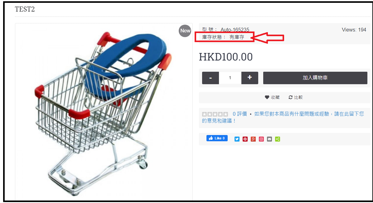 “0”, 改為1或以上的任何數字, 前台便會自動顯示為 “有庫存”.