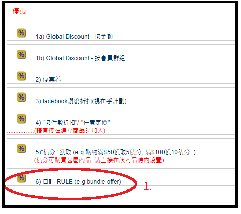 系統已內建了根幾個case, 如您合用, 直接"啓用"它就可以. 如想改金額/商品/品牌/件數的限制條件, 或建立更多新case, 請詳閱以下教學: