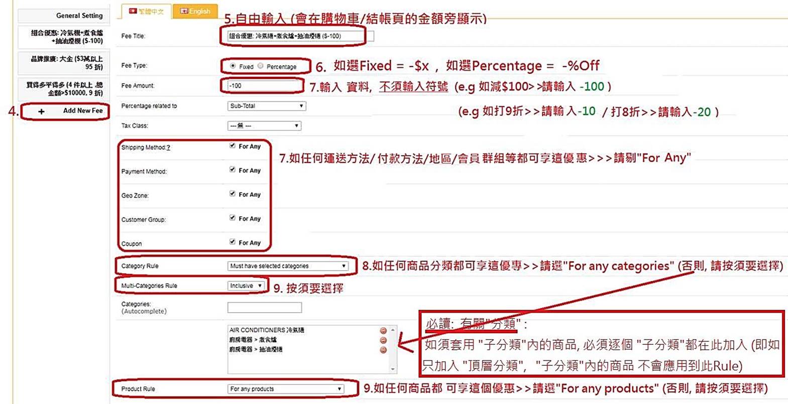 有關分類(必讀) set 自訂RULE”時, 如只add 入頂層分類 (主分類) , “子分類”內的商品不會自動包括在rule 內 (除非建立商品時,同時勾選了 ’主分類” 及 “子分類”) .
