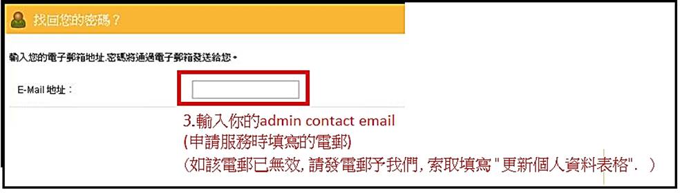 (如 ”忘記密碼” 按鈕不見了, 代表您先前的設置喜好是 “不讓任何人能自助更改密碼” , 這情況, 請電郵聯繫我們, 並註明要 請開放”忘記密碼” 按鈕)