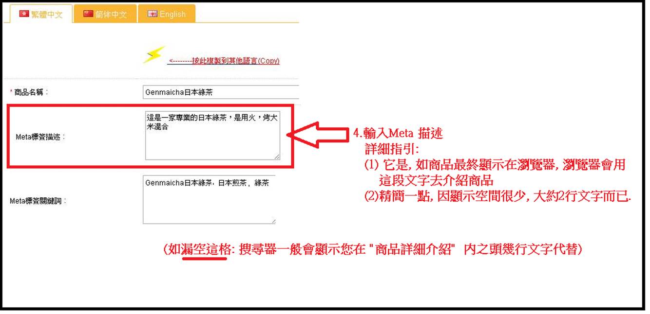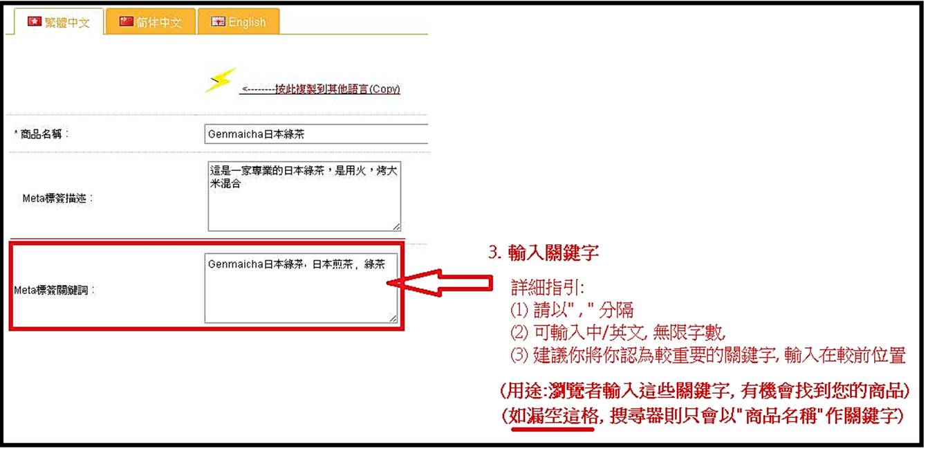 如何設置 “商品meta關鍵字” (meta Keywords) :