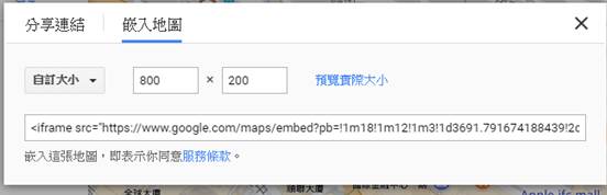 於頂頁選 "嵌入地圖" Tips: 尺寸建議選”自訂大小” 及 高改為 200. |